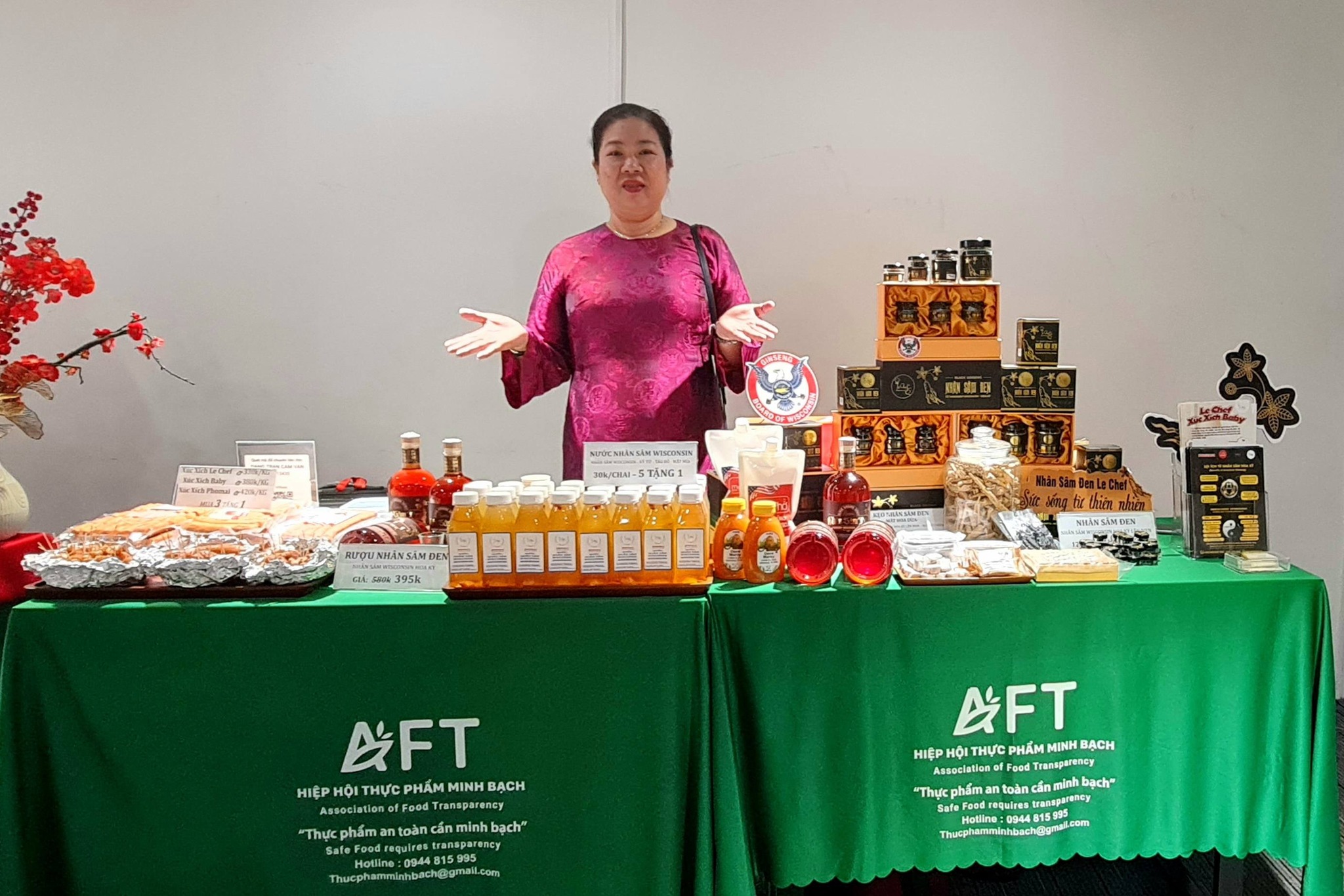Ông Huỳnh Tấn Tấn – Giám đốc Đối ngoại Công ty VEV giới thiệu các dòng sản phẩm Nhân sâm Wisconsin đến TS. Nguyễn Thị Hồng Minh – Chủ tịch Hiệp hội Thực phẩm Minh bạch (AFT), Nguyên Thứ trưởng Bộ Thủy sản. (Nguồn: AFT)
